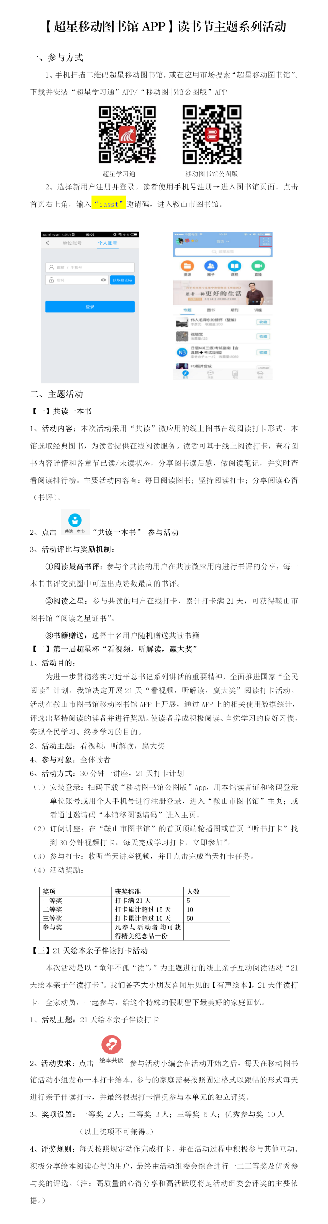 鞍山市图书馆组织参与的由中图学会举办的第二届全国“图书馆杯”主题图像创意设计大赛正如火如荼的进行着,与此同时,CNKI中国知网“‘悦’读之星”答题活动、中华数字书苑“青春阅读,书香致远”线上知识竞答、“中科杯”诗传古韵·词润芳华诗词大赛、超星打卡“共读一本书”等活动也相继上线,将陪同广大市民与读者共同度过一个满盈书香、精彩有趣的读书节。 01 “书香伴我成长”——澳通乐儿线上有奖活动 ——在线闯关拆盲盒,快来领取神秘礼物! 活动时间:4月20日-4月26日 为激发少儿的阅读兴趣和潜能,培养阅读好习惯,鞍山市图书馆联合澳通乐儿于4月20日-4月26日开展4.23魔法乐读节线上有奖活动,鼓励少儿坚持阅读,深潜经典,从而获得思想启迪和审美感悟,实现自我“变身”的“魔法”技能满点,成为“腹有诗书气自华”。 图片模块 02 【CNKI中国知网】满城书香,经典“悦”读 ——“‘悦’读之星”答题活动火热来袭 活动时间:4月20日-4月30日 腹有诗书气自华,最是书香能致远。在这个桃李芳菲的四月,鞍山市图书馆携手中国知网于4月10日至30日,联合全国各级各类图书馆、文化馆、艺术单位等机构共同开展阅读、朗诵、征文、答题等一系列活动。报名还在继续,期待您的加入! 03 【中华数字书苑】“青春阅读,书香致远”线上知识竞答 活动时间:4月20日-4月26日 为迎接4.23世界读书日,方正阿帕比现发起,“青春阅读,书香致远,文学知识竞答活动!”。更有炫酷蓝牙运动耳机,多功能台灯等你来拿,所以爱读书的你,还等什么呢,快来加入我们,一起来答题吧! 04 【超星移动图书馆APP平台】世界读书日主题系列活动 活动时间:4月23日-5月13日 |